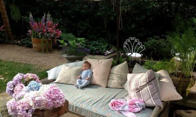 γαλάζιο φορμάκι, περιτριγυρισμένη από λουλούδια. Η μικρή που είναι μόλις